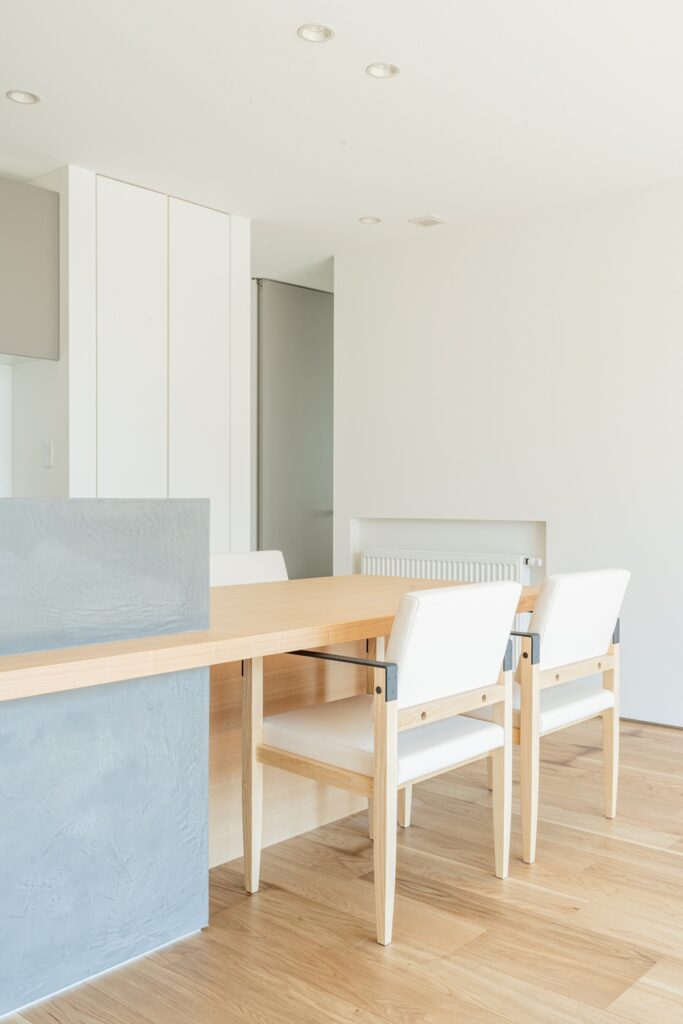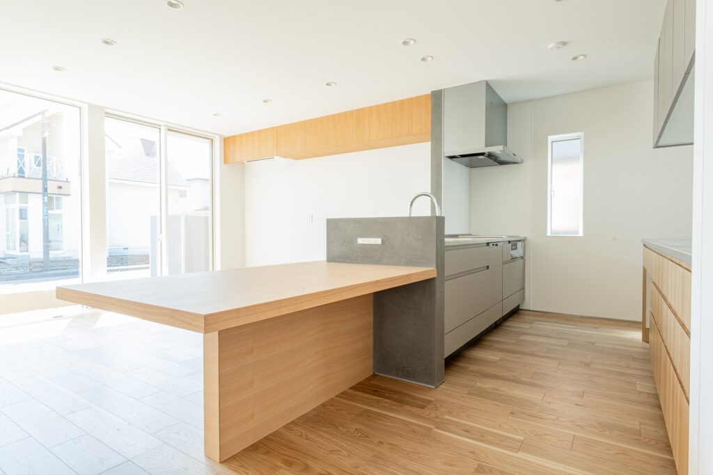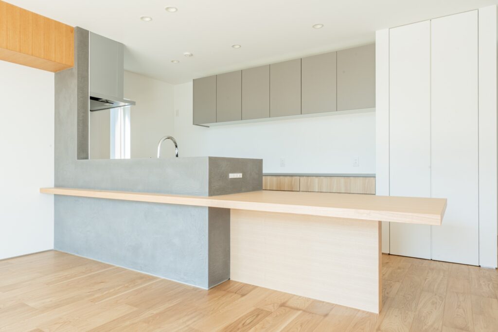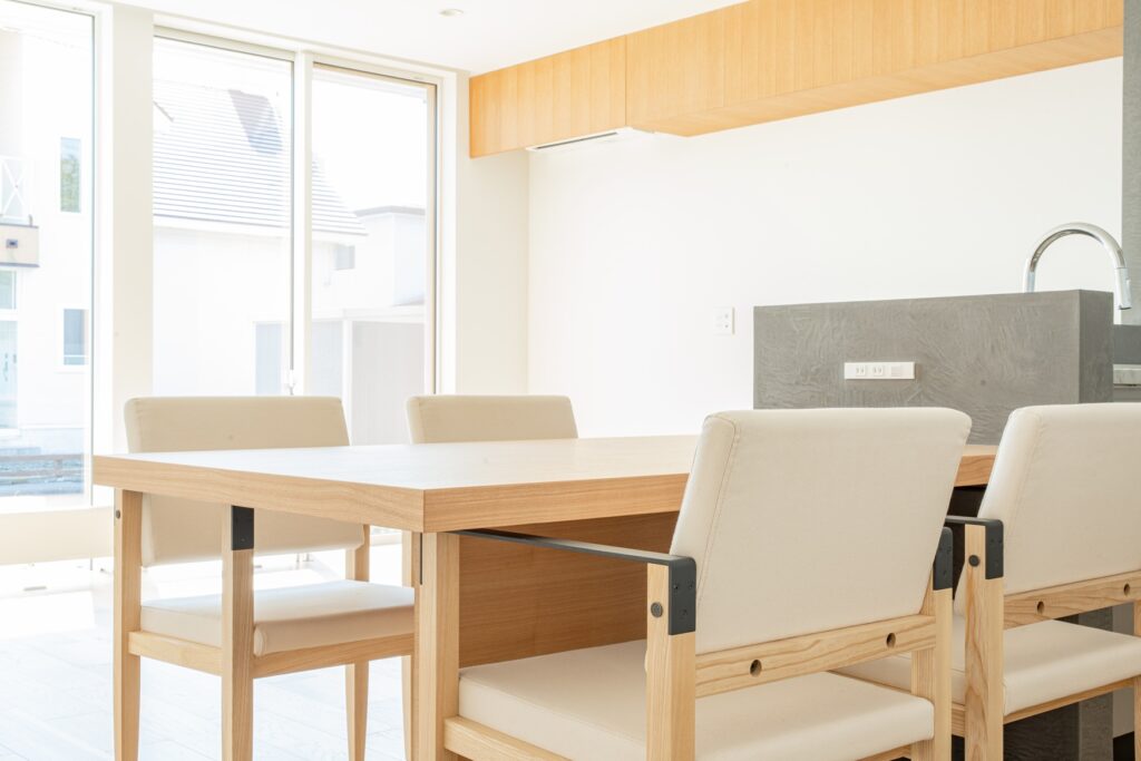 キッチンの壁に固定して製作した特注ダイニングテーブルです。